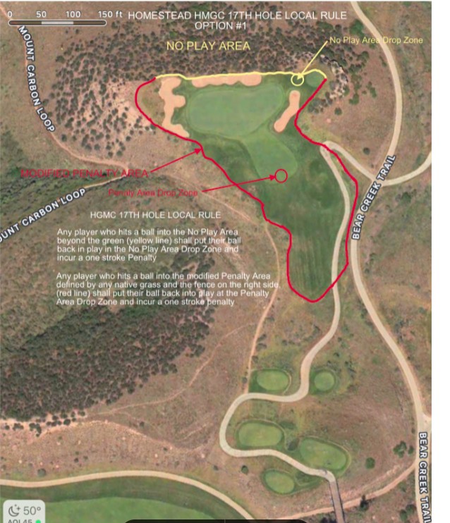 5th hole: If a ball goes into the “ESA,” (area defined by red stakes with green caps) proceed